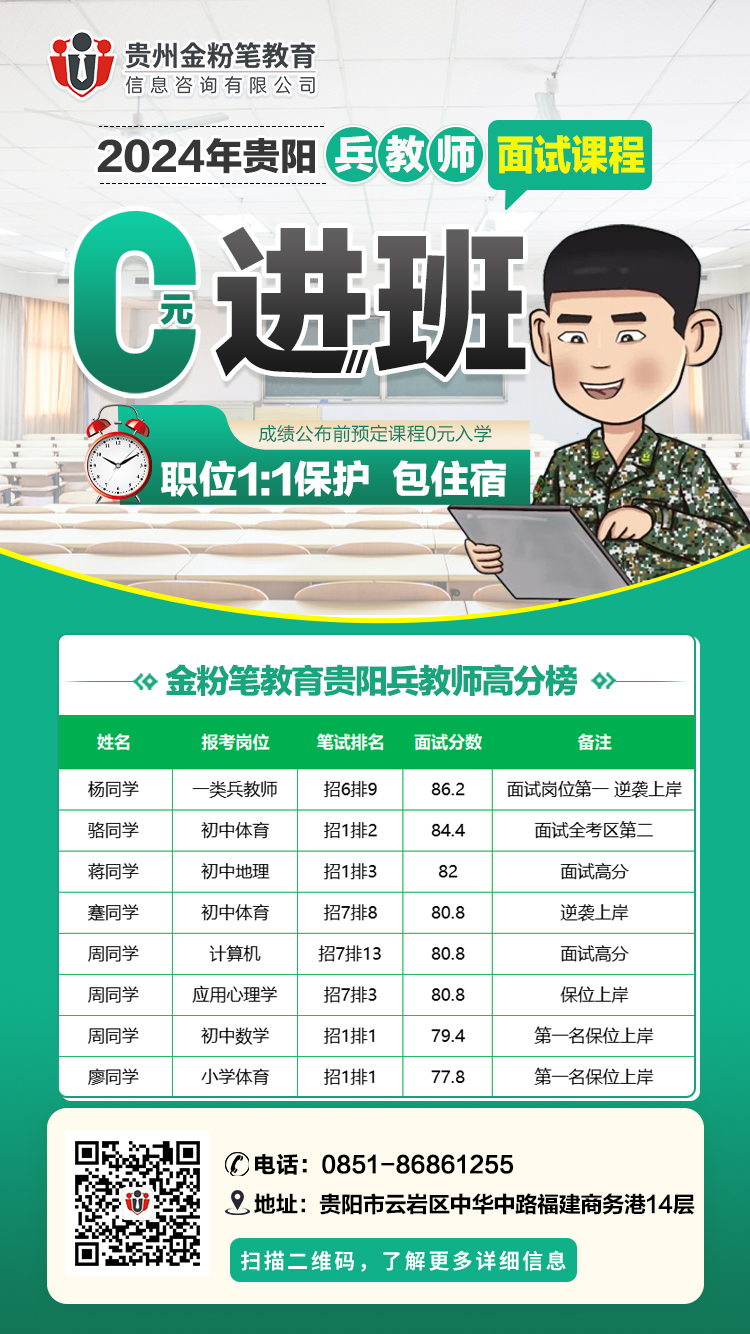 贵州金粉笔教育2024年贵阳兵教师面试专项班优惠活动,在笔试成绩公布前预订面试课程,可0元进班,进入体检后再补费,笔试成绩公布后,未进面试退定金,职位1:1保护,包住宿,小班授课。兵教师面试课程详情咨询及订课:13368515037(微同)