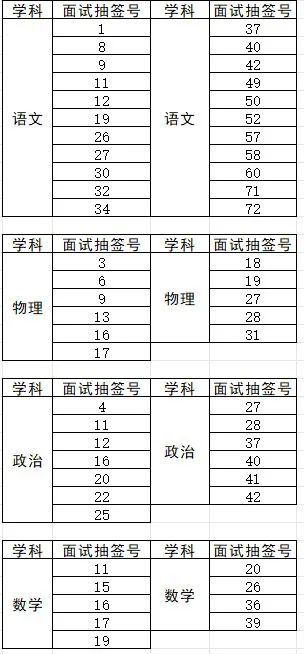 根据《贵阳市第六中学2024年教师招聘工作方案》,按照公平、公开、公正,择优录取的原则,我校2024年教师招聘语文、物理、政治、数学学科面试工作已完成。现将进入试教环节人员面试抽签号公布如下: