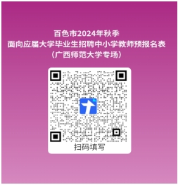 广西师范大学专场:2024年10月30日至2024年11月4日,广西师范大学专场的应聘人员可通过网络进行预报名,使用QQ或微信扫描《百色市2024年秋季面向应届大学毕业生招聘中小学教师公告》中的二维码,如实填写个人相关信息,并提交报名表。应聘人员网络预报名后,需按现场报名方式到现场提交报名材料。应聘人员只能填报一个岗位。