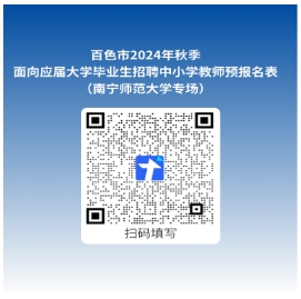 南宁师范大学专场:2024年11月7日,南宁师范大学专场的应聘人员可通过网络进行预报名,使用QQ或微信扫描《百色市2024年秋季面向应届大学毕业生招聘中小学教师公告》中的二维码,如实填写个人相关信息,并提交报名表。应聘人员网络预报名后,需按现场报名方式到现场提交报名材料。应聘人员只能填报一个岗位。