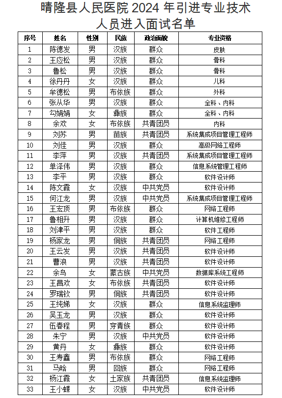 根据《晴隆县人民医院引进专业技术人员公告》及前期报名情况,经院党委研究决定,现将进入面试人员名单(详见附件)及有关事宜公告如下: