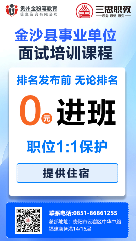 贵州三思职教2024年金沙县事业单位面试培训班,在笔试成绩排名公布前预订课程,无论分差排名0元入学,职位1:1保护,小围赠送住宿,不需要住宿不抵扣尾款,进入体检后后补缴12800元。金沙县事业单位面试培训班预订及详情咨询:13368515037(微同)。