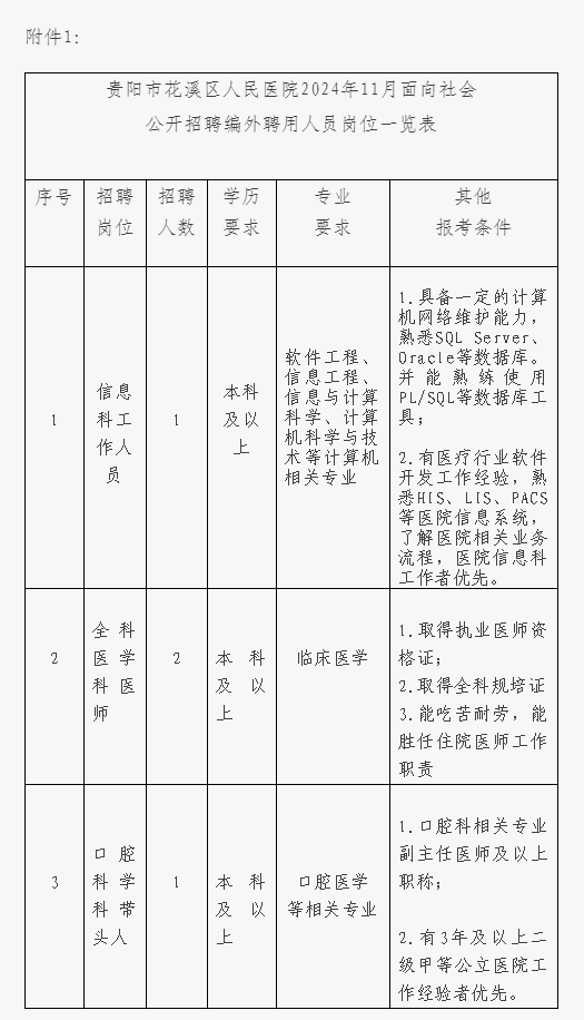 本次拟面向社会公开招聘编外聘用人员。招聘岗位详见《贵阳市花溪区人民医院2024年面向社会公开招聘编外聘用人员岗位一览表》(附件1)。