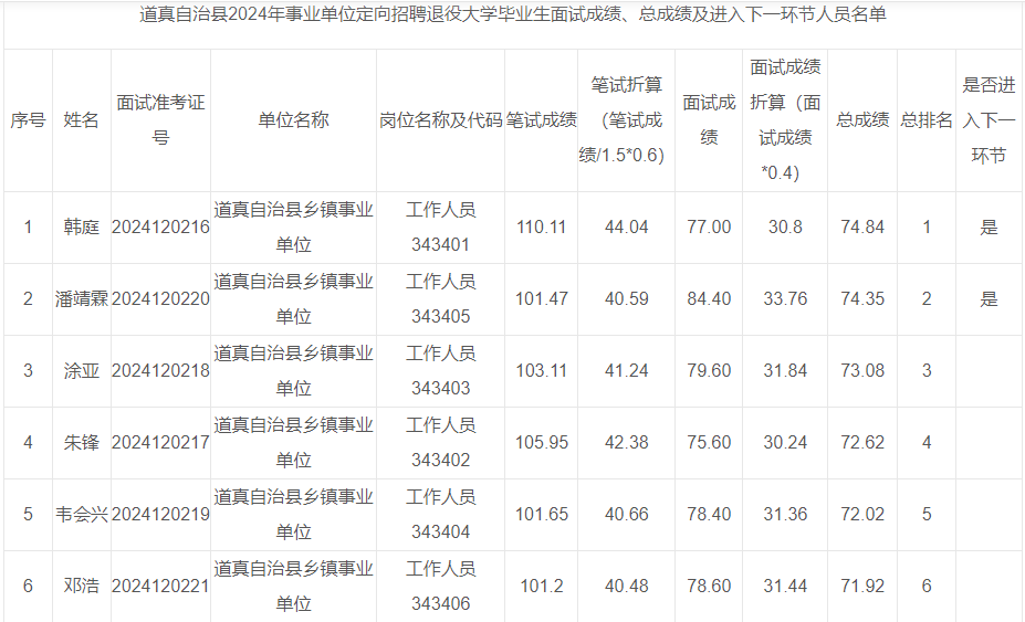 附件:道真自治县2024年事业单位定向招聘退役大学毕业生面试成绩、总成绩及进入下一环节人员名单