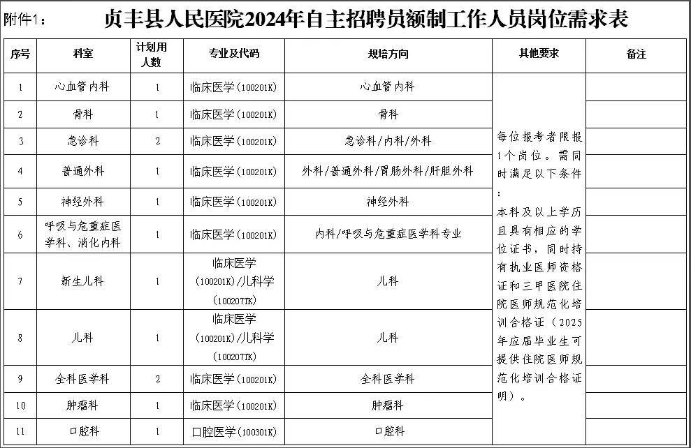 1.贞丰县人民医院2024年自主招聘员额制工作人员岗位需求表