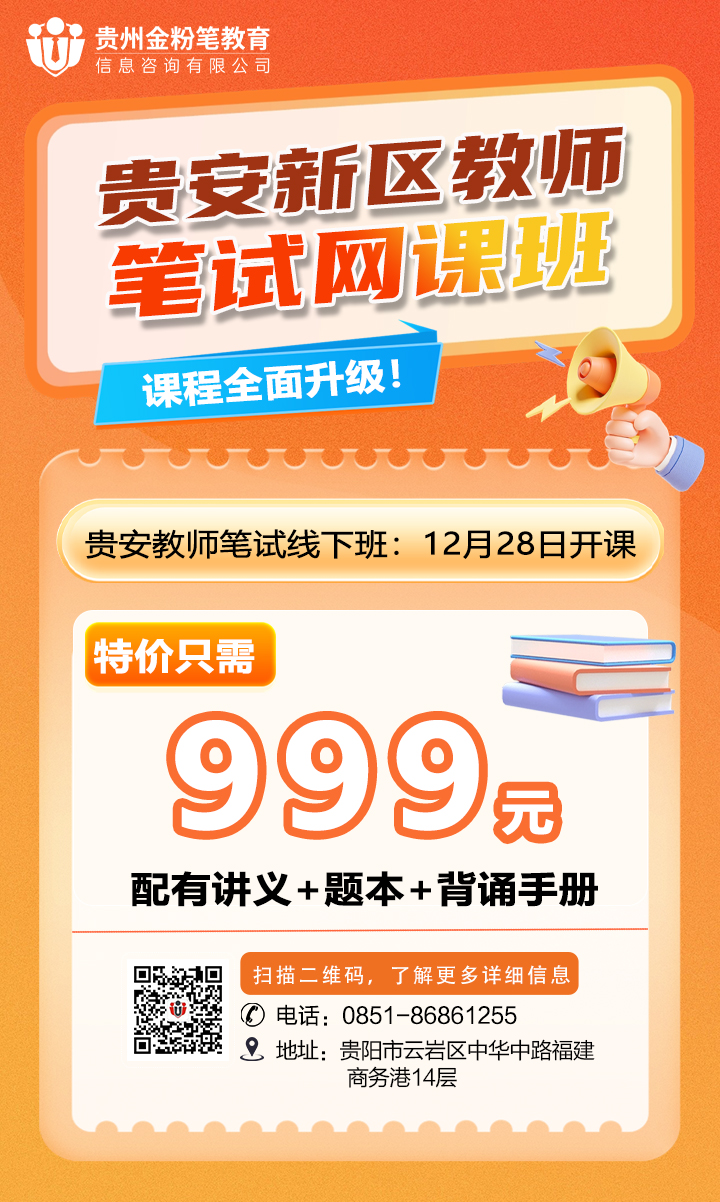 贵州金粉笔2024年贵安新区雇员教师笔试网课来了,课程全面升级,学至考前,12月报班优惠特价只需999元,配有讲义+题本+背诵手册,线上网课,随时随地可学,线下课程开课时间12月28日。网课、线下课程订课及详情咨询:13368515037(微同)。