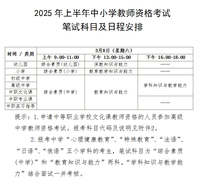附件:1.2025年上半年中小学教师资格考试(笔试)科目及日程安排.docx