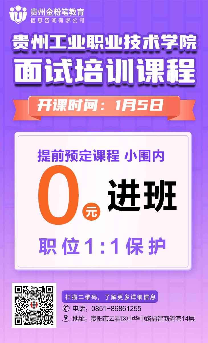 贵州金粉笔贵州工业职业技术学院合同制人员面试课程来了,开课时间1月4日开课,提前报班,小围内0元进班,职位1:1保护,小班授课,全程主讲老师带领,提前预订可享课程活动优惠,贵州工业职业技术学院面试课程详情咨询及预订:13368515037(微同)。