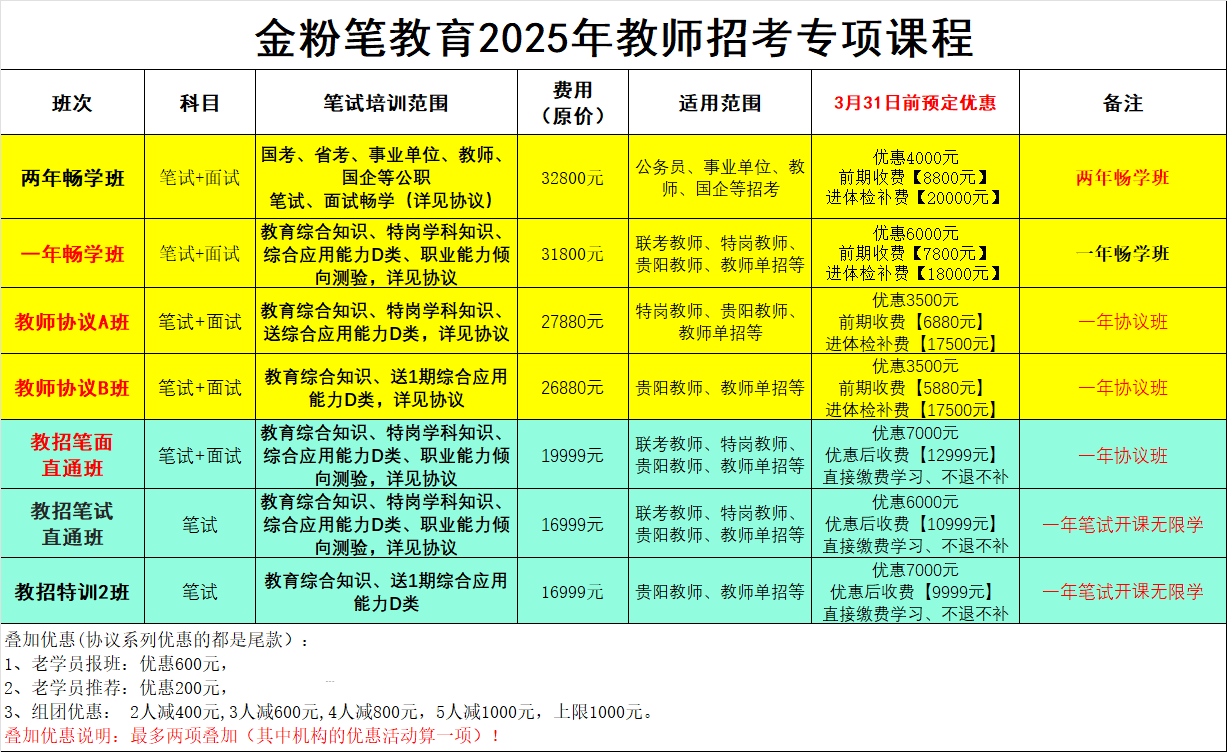 2025年教师招考专项培训课程,教师专项培训班,两年班、一年班、协议班、特训班、笔试班、笔试+面试一体班均有,培训课程适用于联考教师、贵阳教师、特岗教师、教师单招等考试,教师协议班先交部分费用,进入体检再补齐尾款,特训班直接缴费学习,不退不补。教师全职、在职备考均有适合的班次。在2025年3月31日起报名或订课,可享课程活动优惠,具体详见培训课程表,教师培训课程预定及详情咨询:13368515037(微同)。