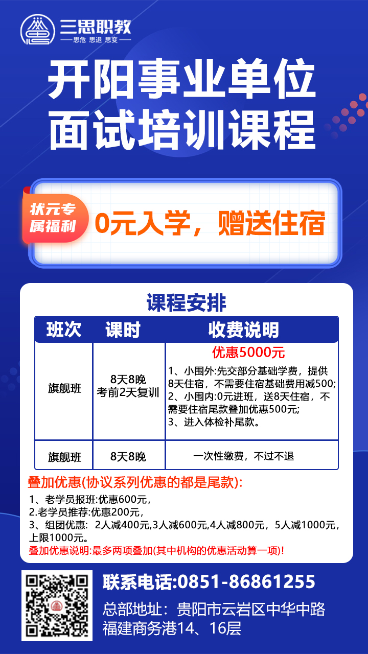 开阳县事业单位面试培训班,状元报协议班0元入班,赠送住宿,报班有优惠,在开课前报班,均可享受课程活动优惠。开阳县事业单位面试班预定及详情咨询:13368515037(微同)。