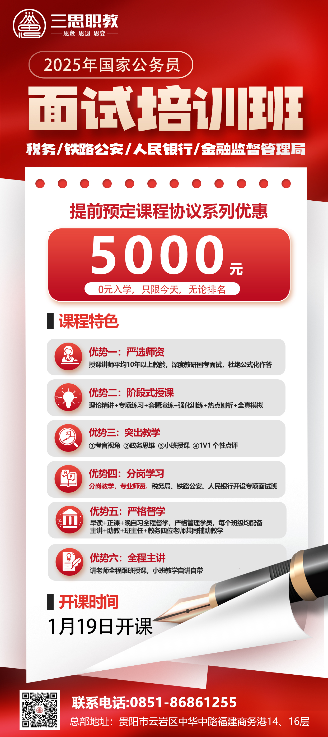 2025年国考面试班优惠活动来了,在活动时间内报班,可享相关课程优惠,国考面试班1月19日开课,课程预订及详情咨询:13368515037(微同)。