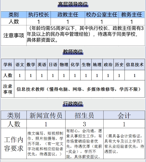 (2)高中:年薪10-15万元,特别优秀的“成熟骨干”教师(年龄不超过45岁)可达20万,其中,有清北班教学经验者(年龄不超过45岁)优先考虑,年薪可达30万。