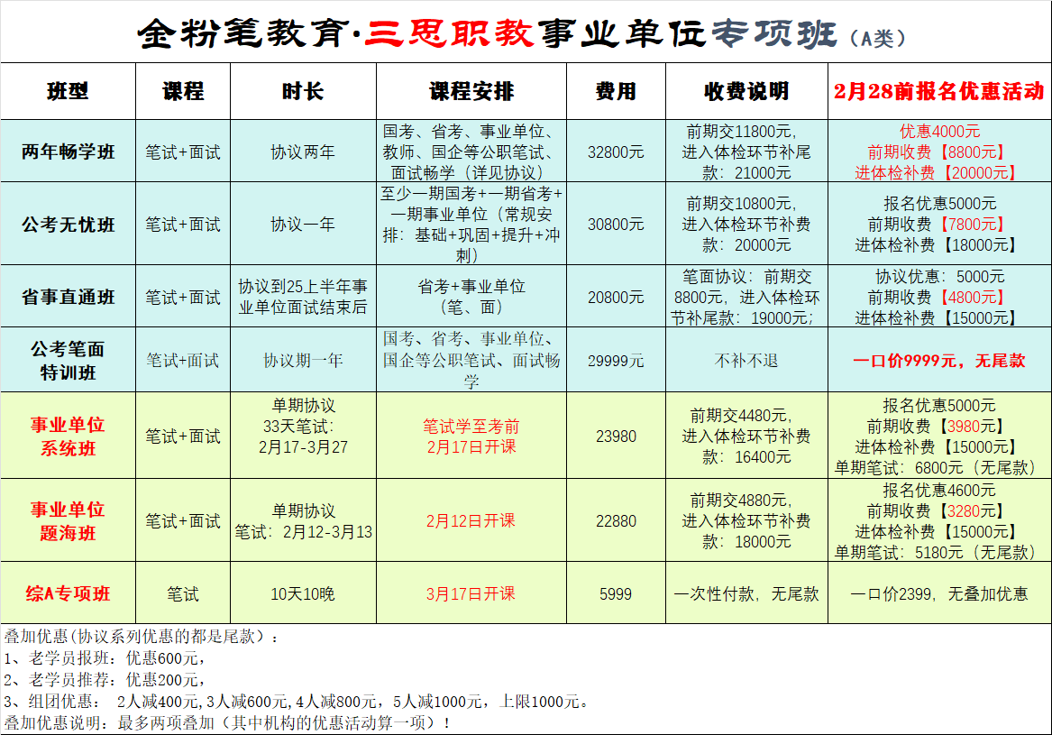 金粉笔教育.三思职教2025年贵州事业单位联考A类专项班开课了,开课时间详情咨询,开设班次有两年畅学班、公考无忧班、事业单位系统班、事业单位题海班、综应A类专项班,班次不同,上课时长不同,贵州事业单位联考A类专项班课程预订及详情咨询:13368515037(微同)。