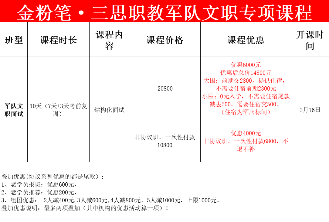 金粉笔.三思职教军队文职面试培训班课程开设了,开课时间2月16日,军队文职面试培训班课程预订及详情咨询:13368515037(微同)。