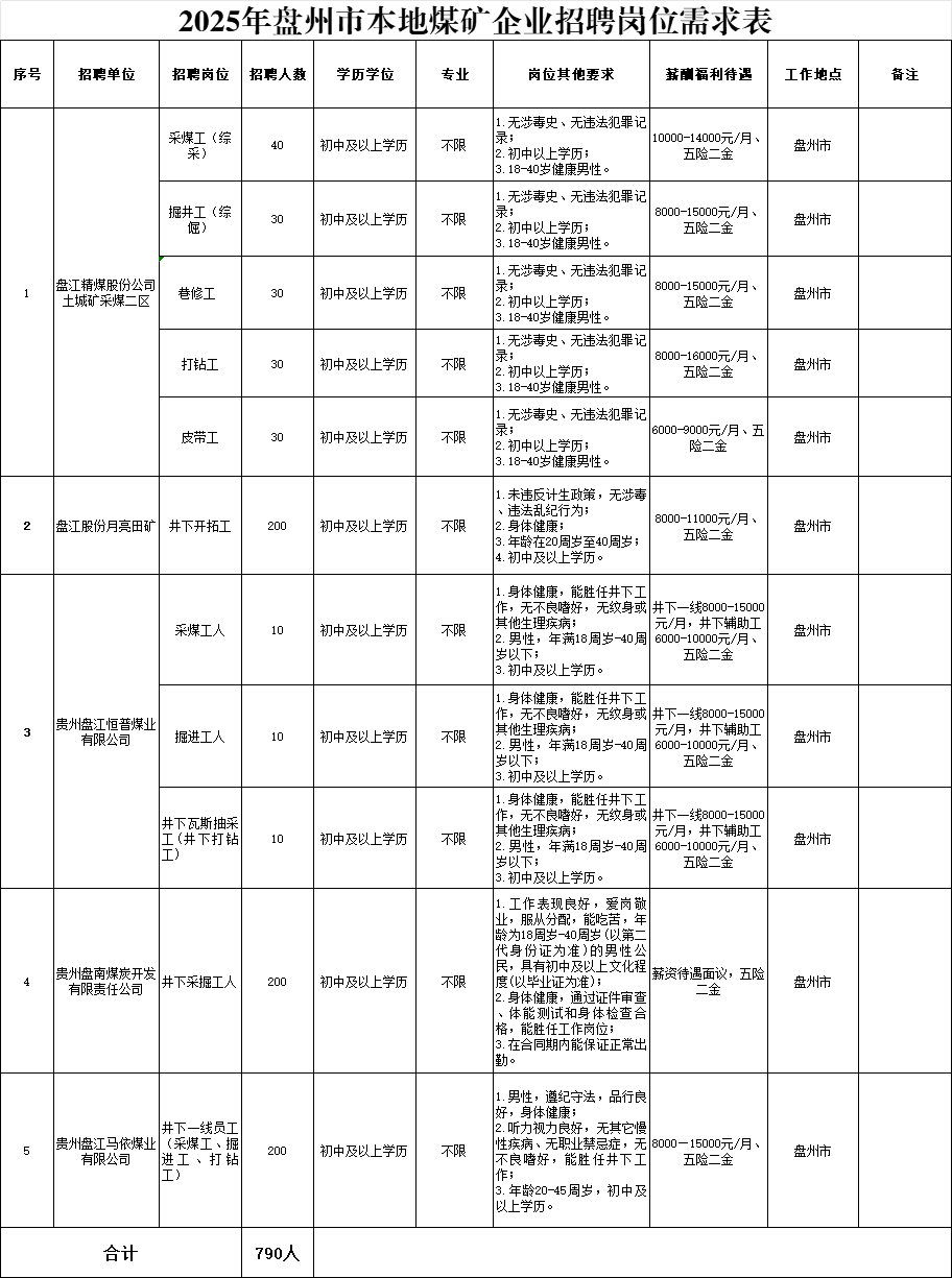 采煤工(综采)40名、掘井工(综倔)30名、巷修工30名、打钻工30名、皮带工30名、井下开拓工200名、采煤工人10名、掘进工人10名、井下瓦斯抽采工(井下打钻工)10名、井下采掘工人200名、井下一线员工(采煤工、掘进工、打钻工)200名,共计790名,具体招聘岗位及要求详见附件1。