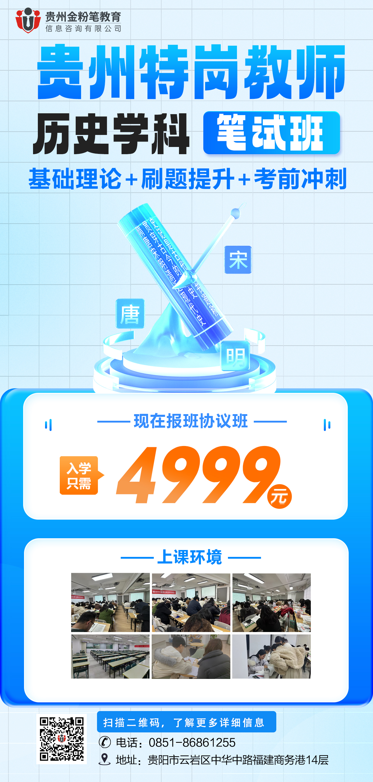 贵州金粉笔2025年贵州历史特岗教师专项培训班来了,开课时间详情咨询,历史特岗培训班次有畅学班、直通班、特训班,在2月28日前预订或报班,可享相关课程优惠,历史特岗教师笔试培训内容教育综合知识+学科专业知识,2025年历史特岗教师培训班预订及详情咨询:13368515037(微同)。