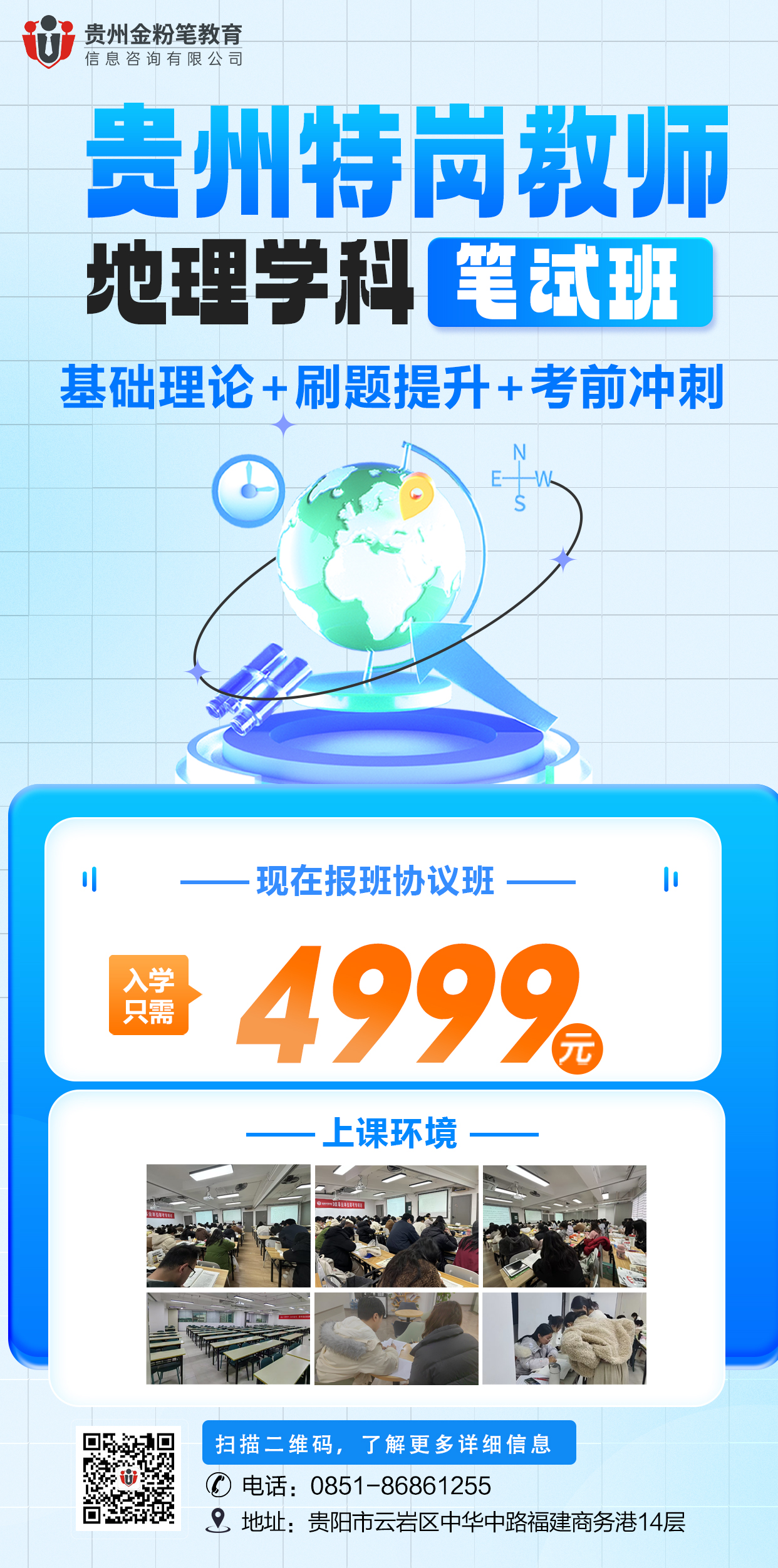 贵州金粉笔2025年贵州地理特岗教师专项培训班来了,开课时间详情咨询,地理特岗培训班次有畅学班、直通班、特训班,在2月28日前预订或报班,可享相关课程优惠,地理特岗教师笔试培训内容教育综合知识+学科专业知识,2025年地理特岗教师培训班预订及详情咨询:13368515037(微同)。
