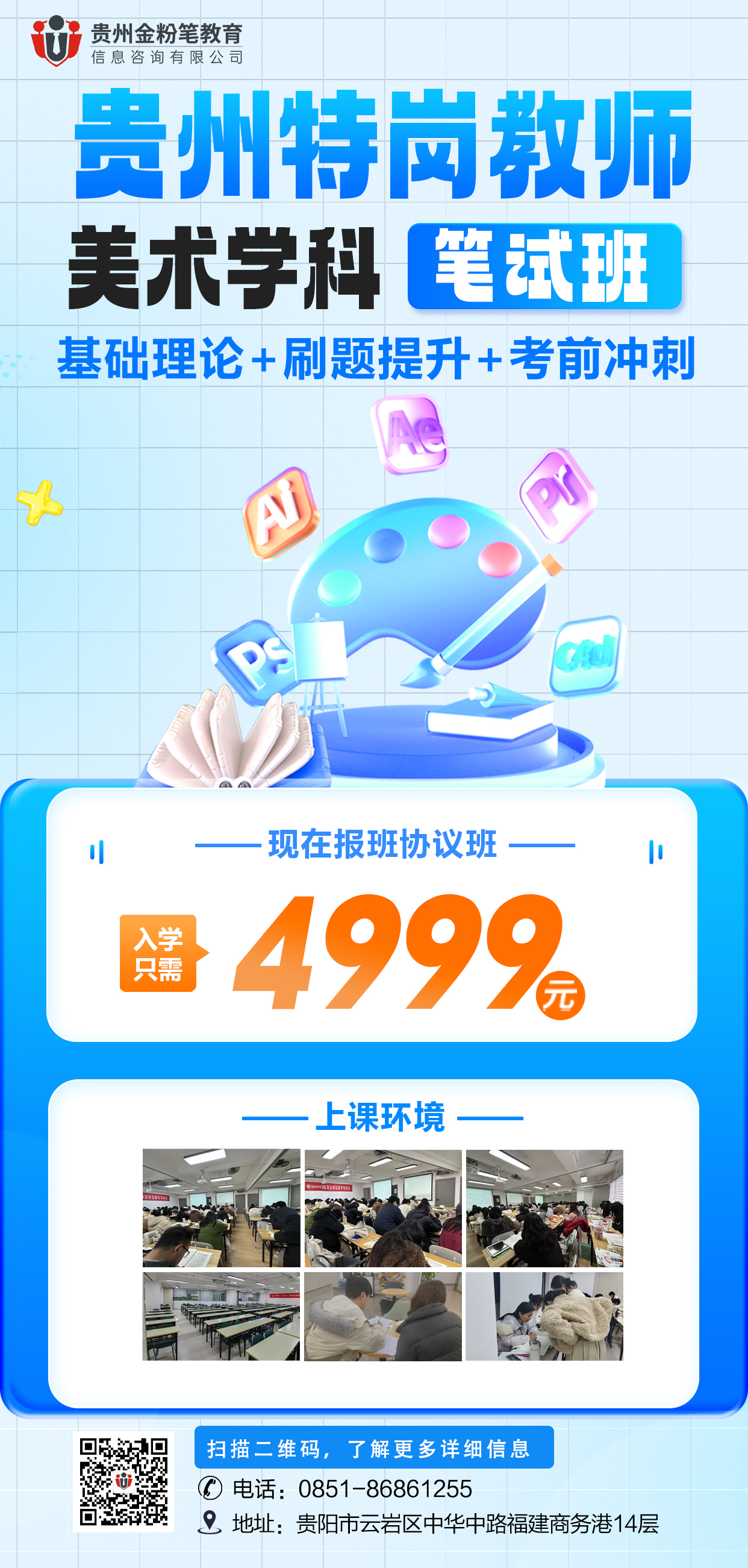贵州金粉笔2025年贵州美术(艺术)特岗教师专项培训班来了,开课时间详情咨询,美术(艺术)特岗培训班次有畅学班、直通班、特训班,在2月28日前预订或报班,可享相关课程优惠,美术(艺术)特岗教师笔试培训内容教育综合知识+学科专业知识,2025年美术(艺术)特岗教师培训班预订及详情咨询:13368515037(微同)。