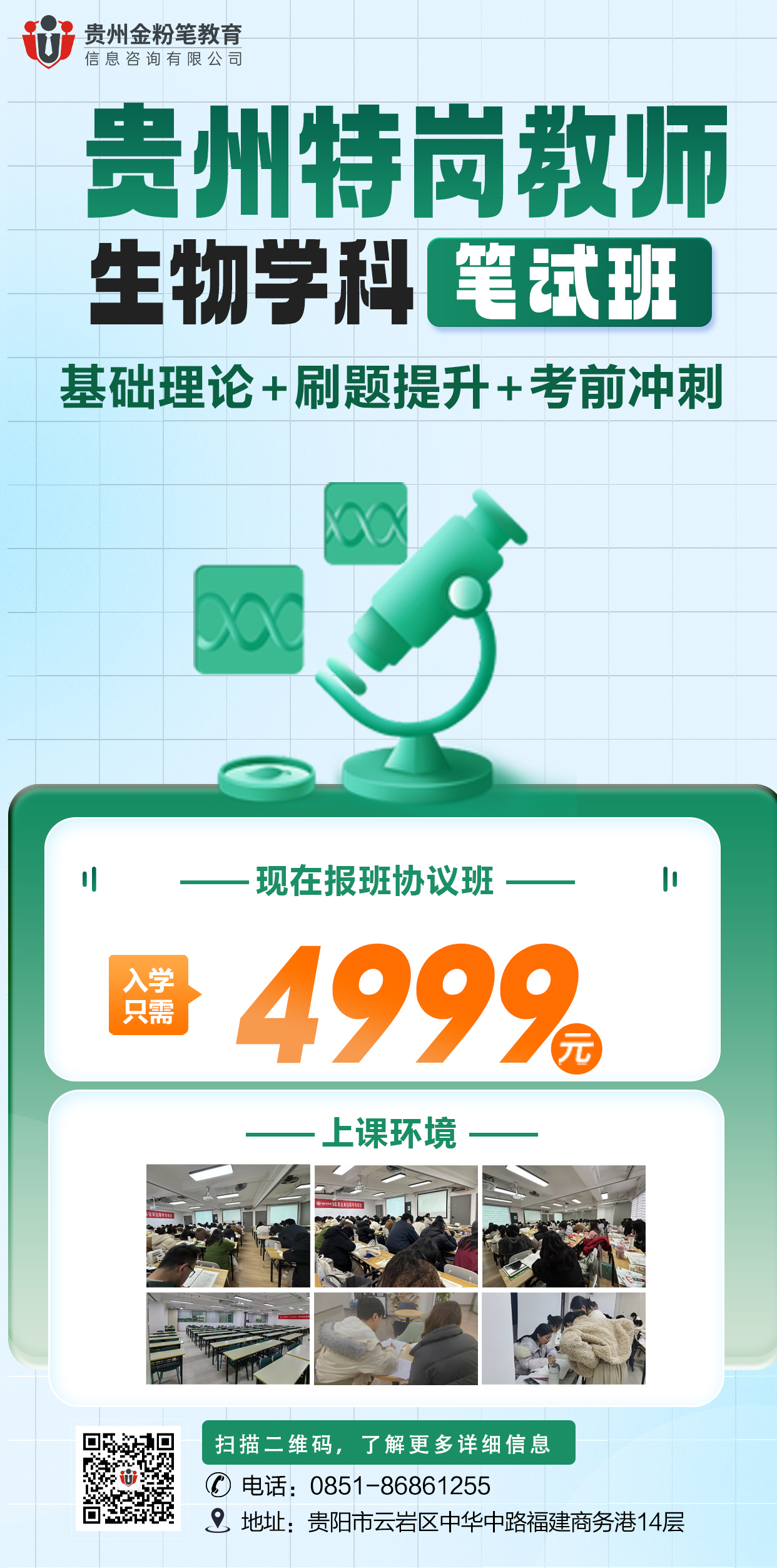 贵州金粉笔2025年贵州生物特岗教师专项培训班来了,开课时间详情咨询,生物特岗培训班次有畅学班、直通班、特训班,在2月28日前预订或报班,可享相关课程优惠,生物特岗教师笔试培训内容教育综合知识+学科专业知识,2025年生物特岗教师培训班预订及详情咨询:13368515037(微同)。