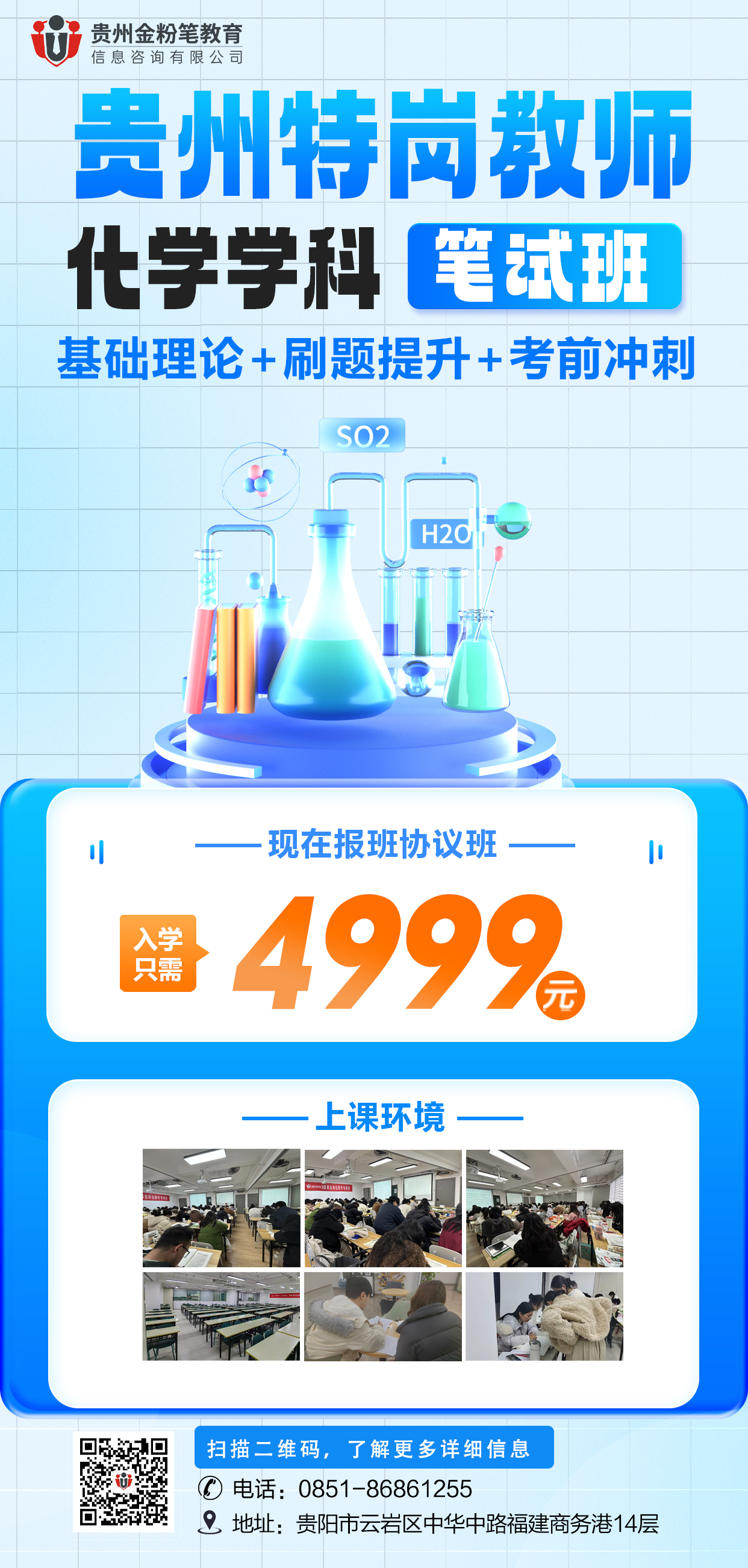 贵州金粉笔2025年贵州化学特岗教师专项培训班来了,开课时间详情咨询,化学特岗培训班次有畅学班、直通班、特训班,在2月28日前预订或报班,可享相关课程优惠,化学特岗教师笔试培训内容教育综合知识+学科专业知识,2025年化学特岗教师培训班预订及详情咨询:13368515037(微同)。