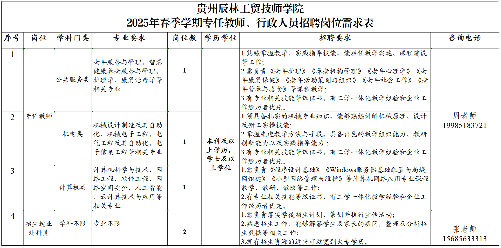 根据工作需要,我校拟面向社会公开招聘专任教师3名、行政人员2名,详见下表: