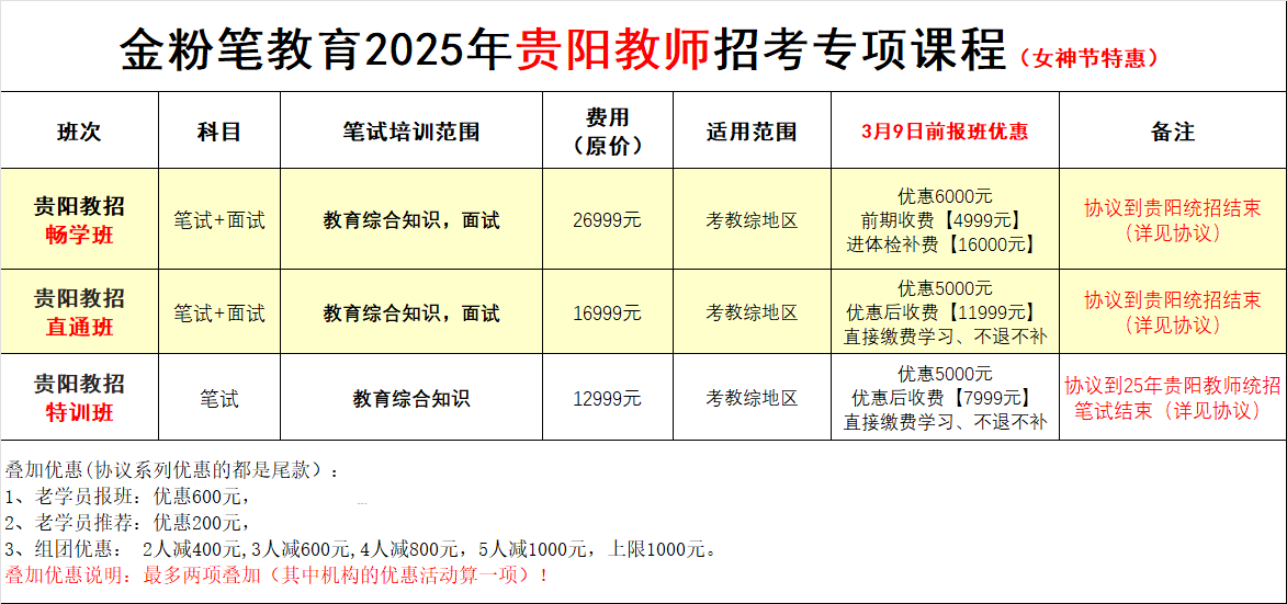 贵州金粉笔2025年贵阳教招考试培训班来了,正在开课中,班次有畅学班(笔试+面试一体班)、直通班(笔试+面试一体班)、特训班(笔试班),笔试培训内容《教育综合知识》,适用范围考《教综》地区教师考试,在3月9日前报名2025年贵阳教招考试各班次,可享5000元优惠。2025年贵阳教招考试培训班报班及详情咨询:13368515037(微同)。