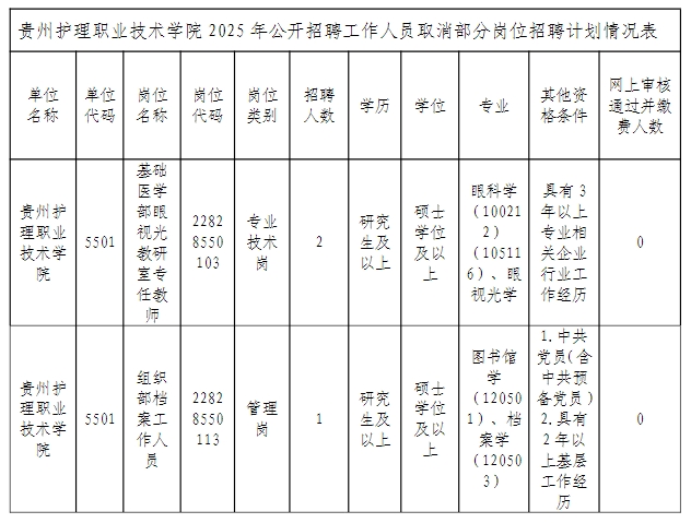 贵州护理职业技术学院 2025 年公开招聘工作人员报名工作已结束。根据《贵州护理职业技术学院 2025 年公开招聘工作人员方案》规定,现取消部分岗位招聘计划,具体情况如下: