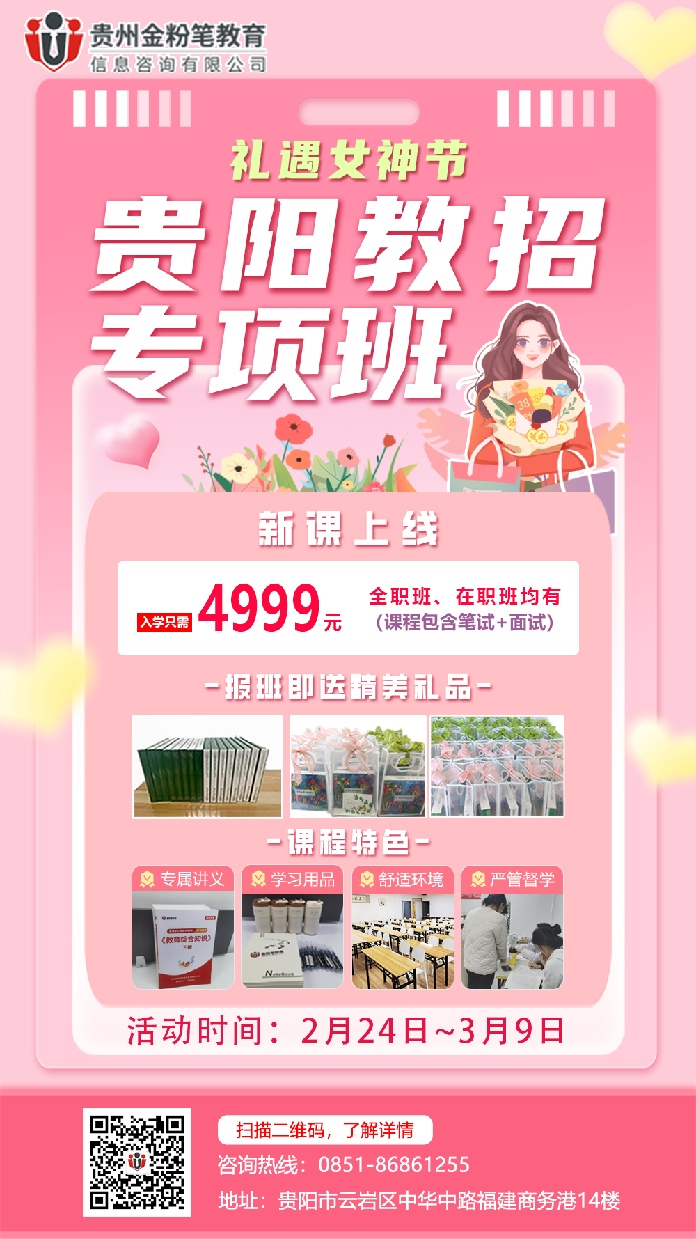 贵州金粉笔教育25年贵阳教招培训班课程优惠活动来了,在2月24日至3月9日期间,报贵阳教招培训班,可享课程优惠,并赠送精美礼品一份。贵阳教招培训班预订及优惠详情咨询:13368515037(微同)。