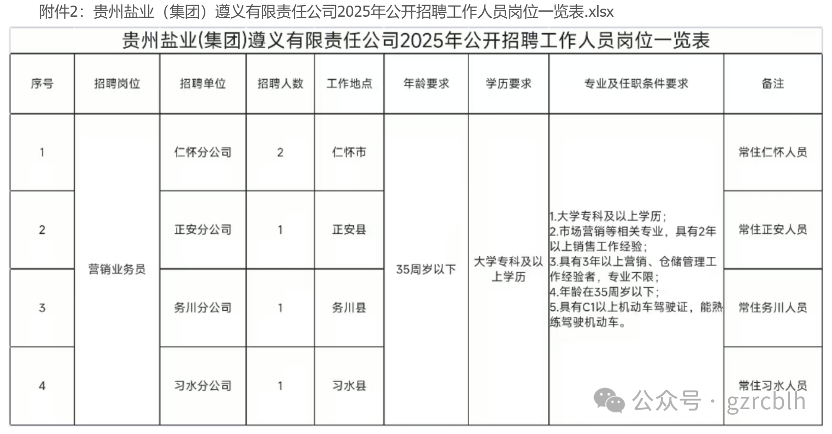 本次计划招聘仁怀分公司、习水分公司、务川分公司、正安分公司营销业务员5名,具体岗位及工作地点详见附件。劳动用工方式为劳务派遣制(通过一年劳务派遣后,经考核优秀者可与用人单位签订劳动合同)。