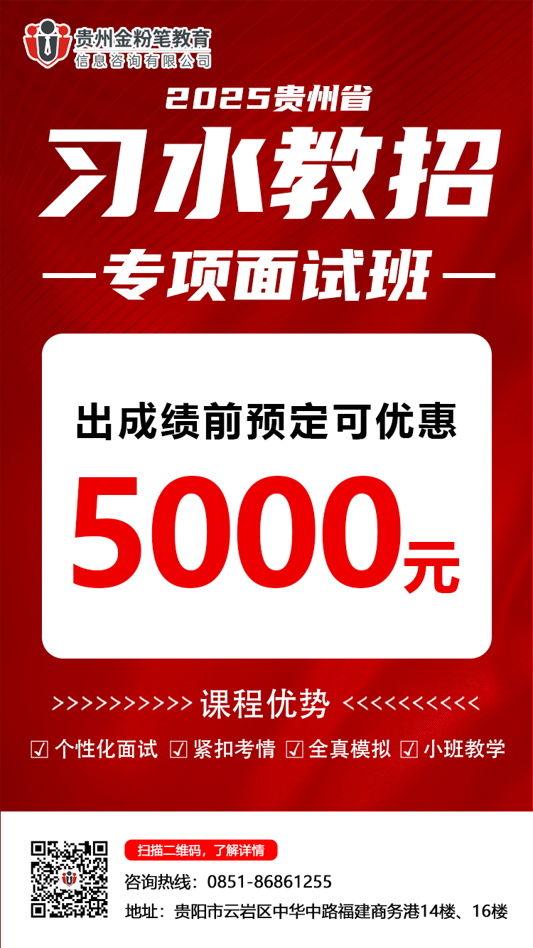 贵州金粉笔2025年习水县教师面试培训班预约开始了,在笔试成绩公布前预约面试班,可享最大课程优惠。习水县教师面试培训班预约及详情咨询:13368515037(微同)。