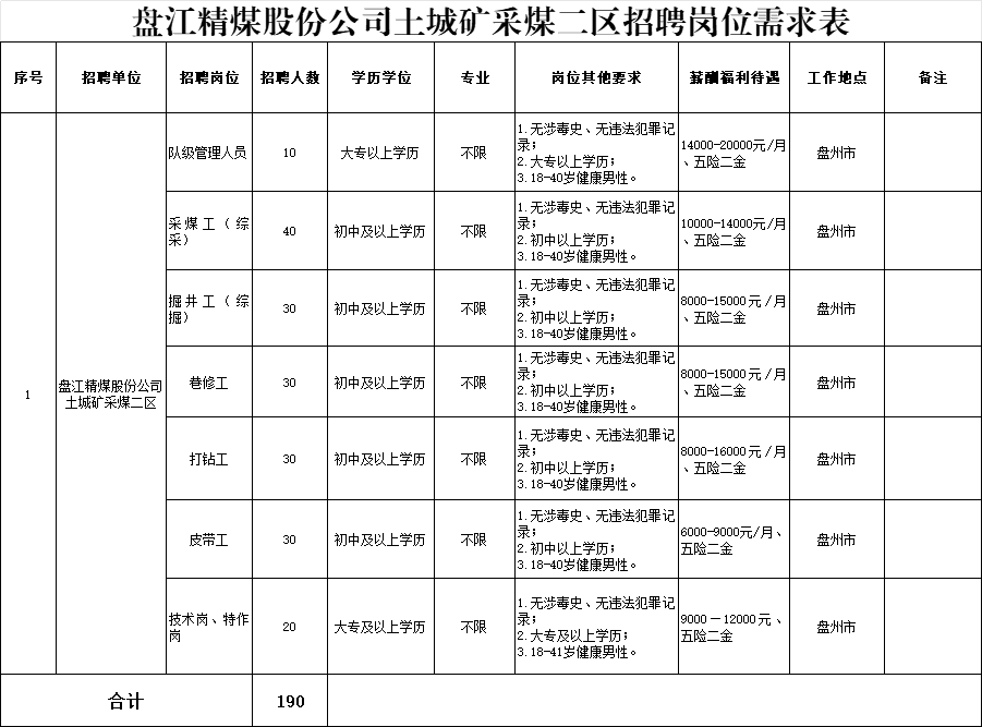 队级管理人员10名、采煤工(综采)40名、掘井工(综倔)30名、巷修工30名、打钻工30名、皮带工30名、技术岗10名、特做岗10名,共计190名,具体招聘岗位及要求详见附件1。