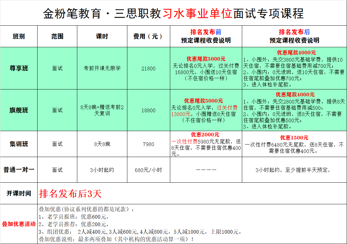 贵州金粉笔.三思职教2025年习水县事业单位面试培训班课程来了,开课时间笔试排名公布后,培训班次有尊享班、旗舰版、集训班、一对一班次,班次不同,上课时长及费用不同,全程主讲老师带领,严管督学,讲练测考相结合,三分理论,七分实战,根据考生不同优劣势,打造答题亮点及得分点。习水面试培训班优惠活动进行中,详见面试培训课程,习水事业单位面试班预订及详情咨询:13368515037(微同)。