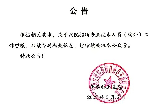 玉溪镇卫生院关于暂缓招聘卫生专业技术人员(编外)的公告