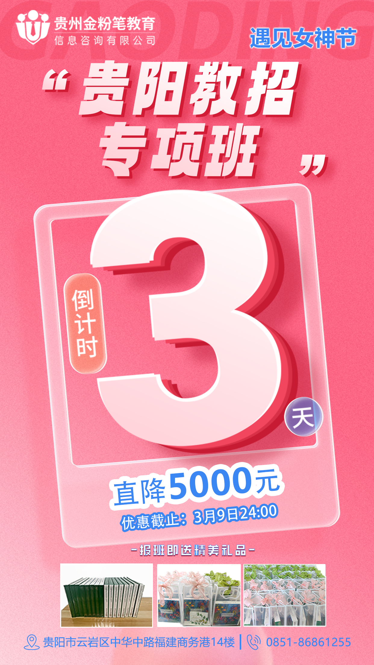 贵州金粉笔教育2025年贵阳教师考试培训班课程3月8日女神节优惠来了,在3月9日前预订课程或报班,最高可享5000元优惠,报班即送精美礼品一份。贵阳教师考试培训班预订及详情咨询:13368515037(微同)。