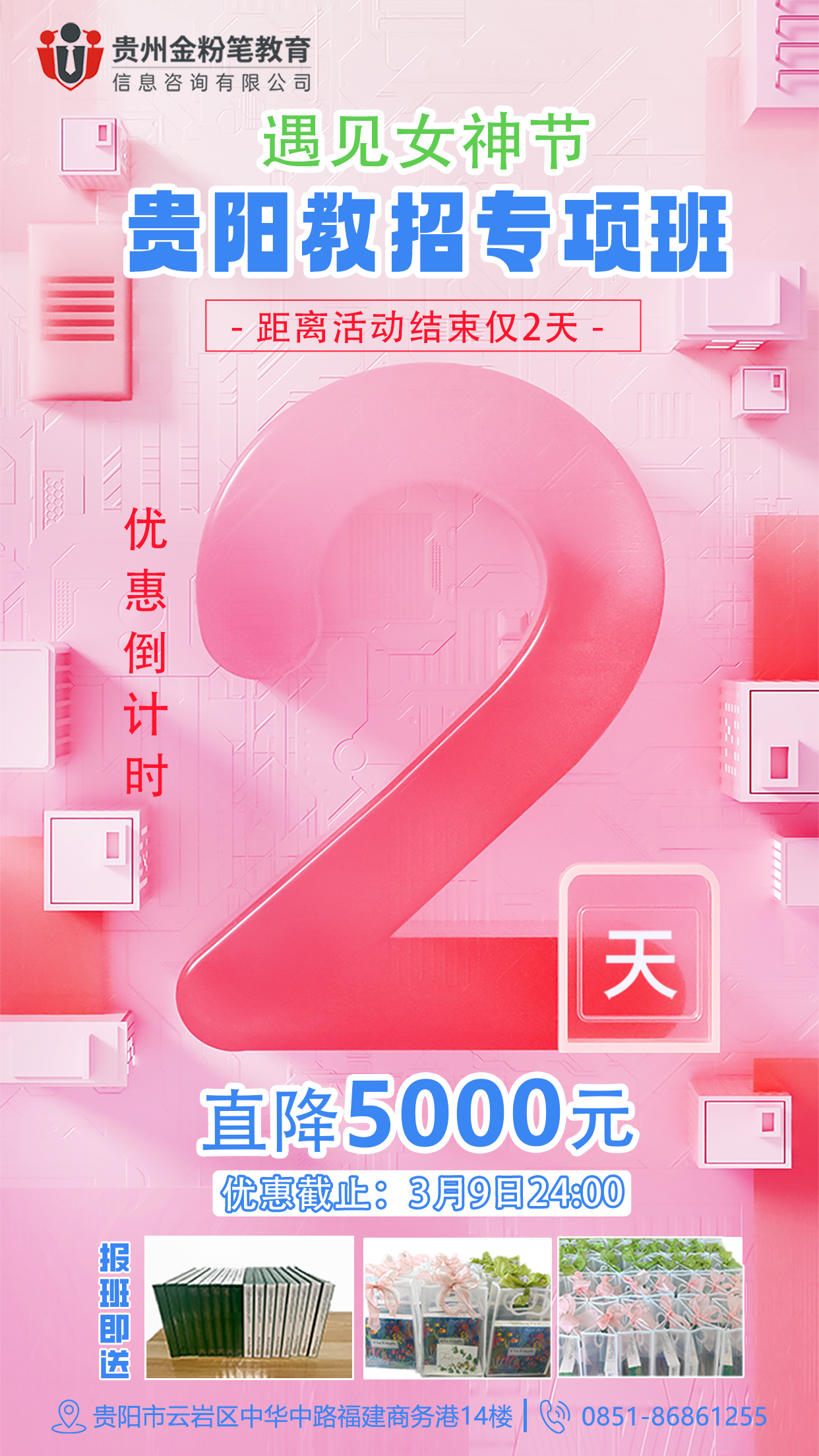贵州金粉笔教育2025年贵阳教师考试培训班课程3月8日女神节优惠来了,在3月9日前预订课程或报班,最高可享5000元优惠,报班即送精美礼品一份。贵阳教师考试培训班预订及详情咨询:13368515037(微同)。