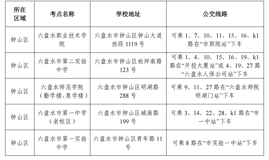 六盘水考区笔试共设18个考点,各考点名称、考点详细地址及到达公交线路如下: