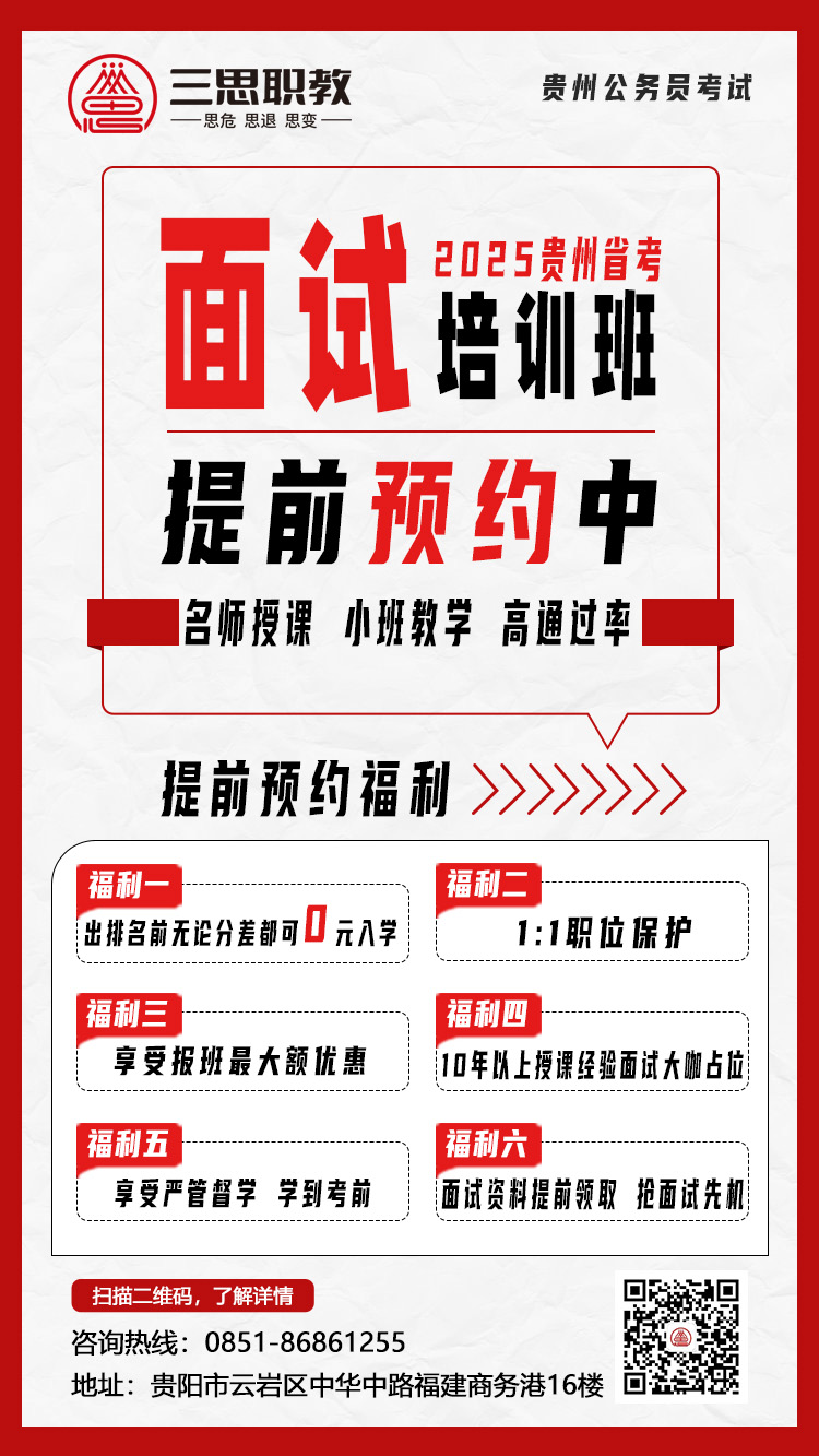 贵州金粉笔.三思职教2025年贵州省考面试培训班正在预订,在笔试成绩公布前预订,可享最大面试课程优惠,贵州省考面试培训班预订及详情咨询:13368515037(微同)。