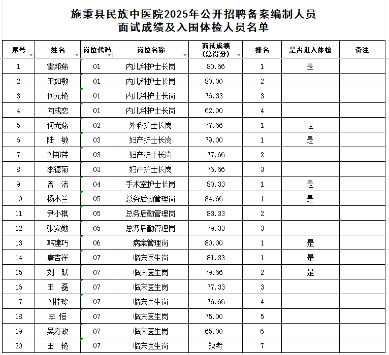 根据《施秉县民族中医院2025年公开招聘备案编制人员实施方案》的有关规定,我单位已完成面试工作,现将考生成绩排名及入围体检人员名单进行公示。公示时间为:2025年3月19日—2025年3月21日。