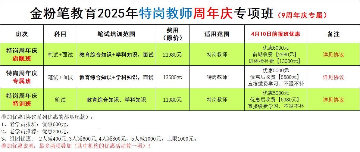 贵州金粉笔2025年特岗教师周年庆专项班开始了,2025年恰值贵州金粉笔教育成立9周年,为了更好的回馈支持贵州金粉笔的新老学员,针对特岗教师培训,特推出了周年庆特岗教师专项班,班次有特岗周年庆旗舰班、特岗周年庆协议班、特岗周年庆特训班,在4月10日前报班或预订特岗培训班,可享周年庆优惠活动,价格更优,费用更省,培训更划算。特岗周年庆专项班预订及详情咨询:13368515037(微同)。
