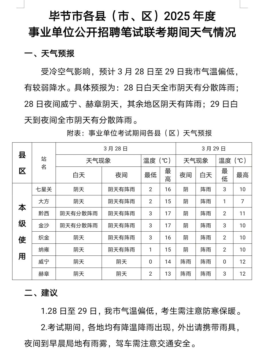 2.毕节市2025年事业单位公开招聘笔试联考暨“三支一扶”计划招募笔试期间天气情况