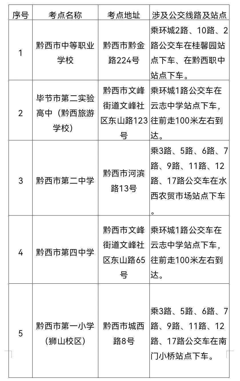 为方便大家顺利赴考,考试当日将增加途经各考点的公交班次。具体线路信息请查看第二部分“考点设置”内容。若需咨询乘车安排或了解实时信息,欢迎联系黔西市交通运输局:0857-4222538。