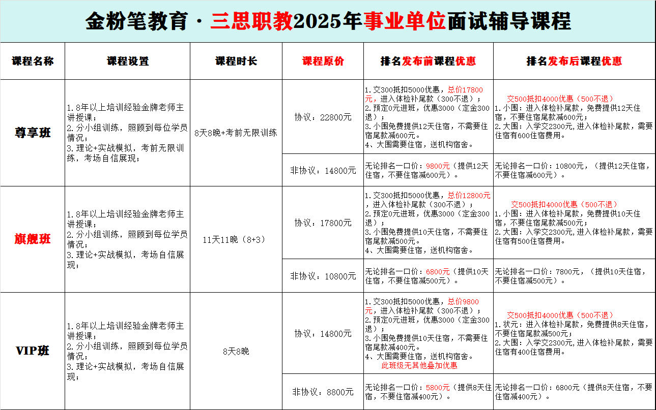 贵州金粉笔.三思职教2025年贵州事业单位面试培训班开始了,事业单位面试培训班有协议班、实战班和一对一班次,满足各类考生对于事业单位面试培训时长要求,班次不同,培训时长和费用不同,事业单位面试培训班全程主讲老师带领,严管督学,三分理论,七分实战。