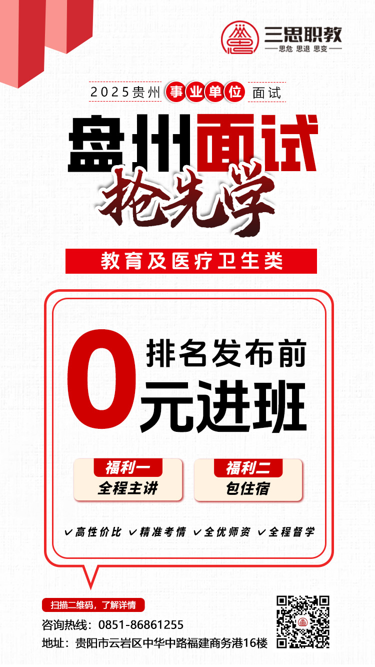 贵州金粉笔.三思职教2025年盘州事业单位面试培训班课程来了,盘州事业单位面试培训班有协议班、特训班、一对一班次,全职主讲,分岗分类培训,贴合事业单位面试考情。盘州事业单位面试培训班预订及详情咨询:13368515037(微同)。