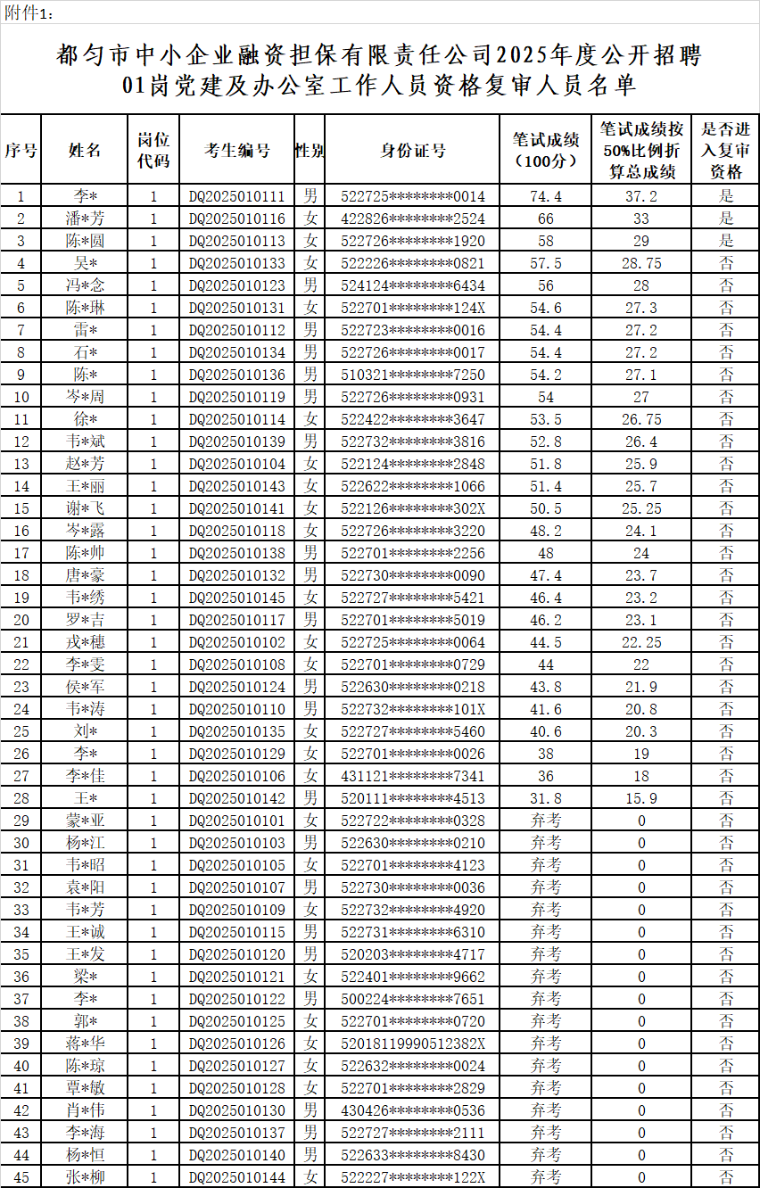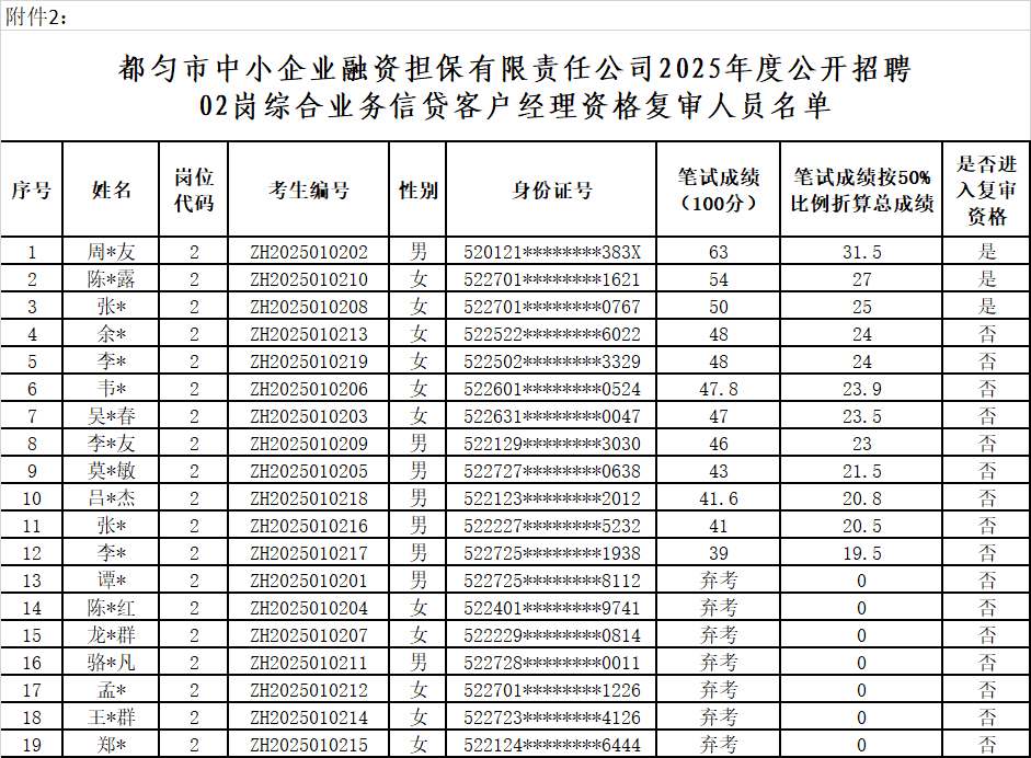 附件:都匀市中小企业融资担保有限责任公司2025年公开招聘现场资格复审人员名单