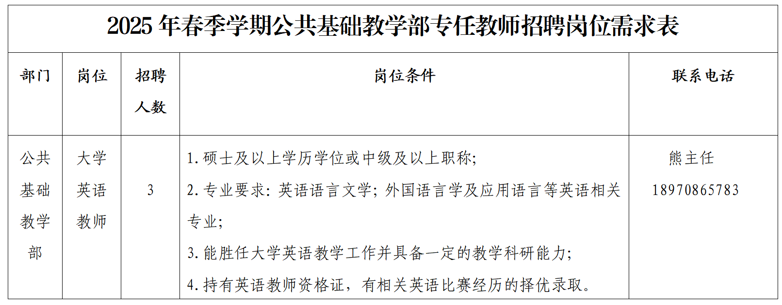 根据工作需要,我校拟面向社会公开招聘大学英语教师3名,详见附件:2025年春季学期公共基础教学部专任教师招聘岗位需求表。海外院校毕业生取得的学历学位证书应获得教育部认证、2025年普通高校应届毕业生未取得毕业证书、学位证书的可先行报名及笔试、试讲,经笔试、试讲、拟录用公示、政审、体检并于2025年12 月 31 日之前取得毕业证书、学位证书的,可按规定聘用,否则不予聘用。