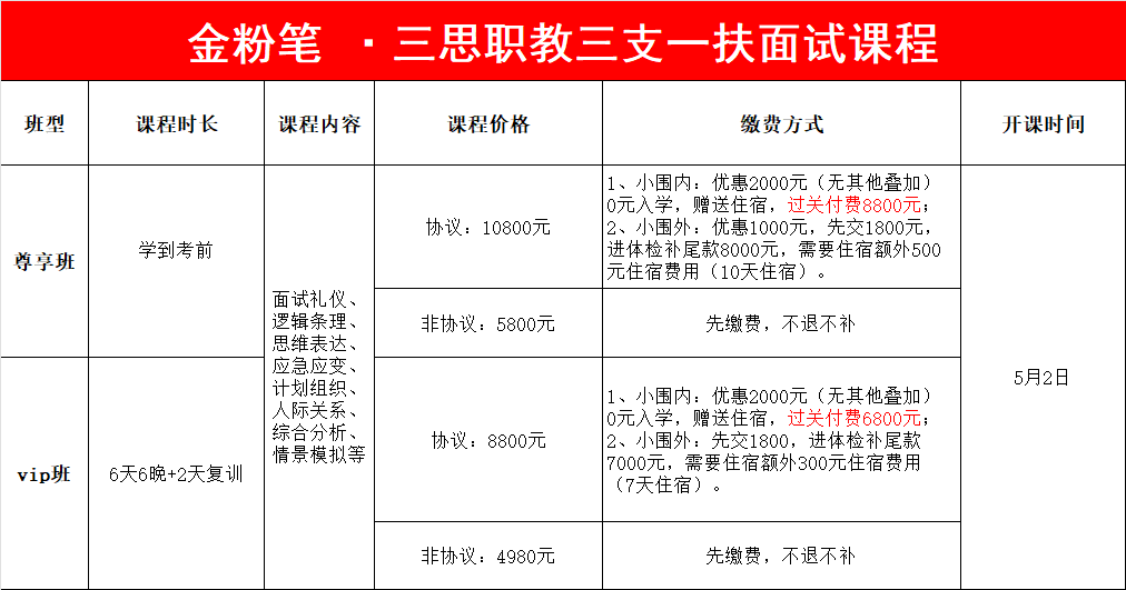 贵州金粉笔.三思职教2025年三支一扶面试培训班课程来了,面试培训内容结构化面试,全程主讲老师带领,注重实战。开课时间5月2日,班次有协议班和非协议班,贵州三支一扶面试培训班预约或详情咨询:13368515037(微同)。