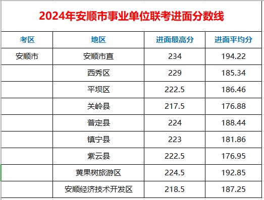 2025年贵州安顺事业单位联考笔试多少分可以进面?根据往年安顺进面分数来看,最高进面分为234分,最低进面分217.5分,为了考生能够了解更安顺各县区进面分情况,贵州金粉笔教育整理安顺各县区进面分数详情,可提供考生查看(仅供参考)!