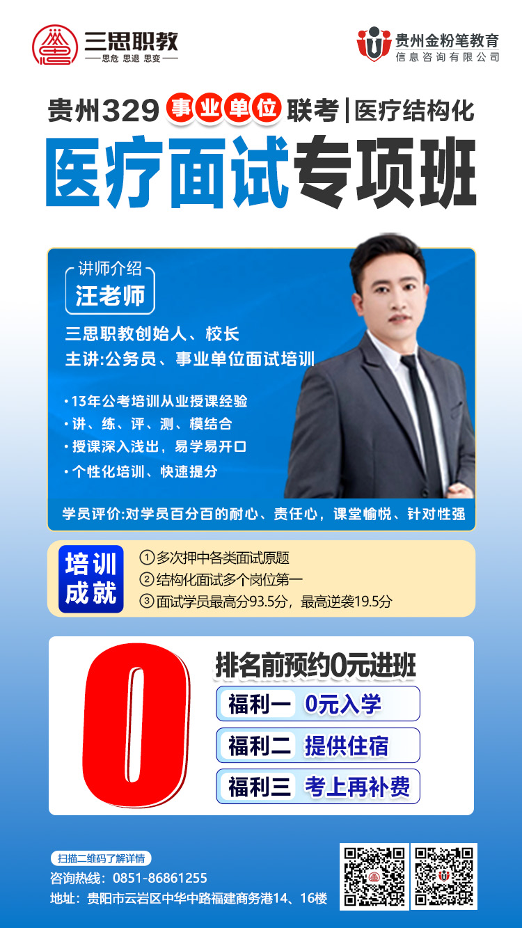 贵州金粉笔.三思职教2025年贵州事业单位联考E类医疗岗面试培训班课程优惠来了,在贵州事业单位医疗岗笔试成绩排名公布预约或报面试培训班,不论排名分差,可0元入学,提供住宿。贵州事业单位联考医疗岗面试培训班预约或详情咨询:13368515037(微同)。