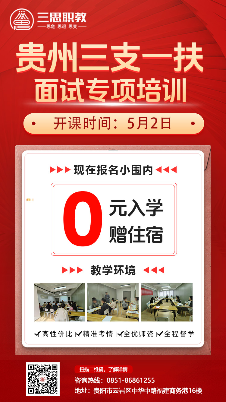 贵州金粉笔.三思职教2025年贵州三支一扶面试培训班课程优惠来了,开课时间5月2日,小围内可0元入学,进入体检后再补费用。贵州三支一扶面试培训班预约及详情咨询:13368515037(微同)。