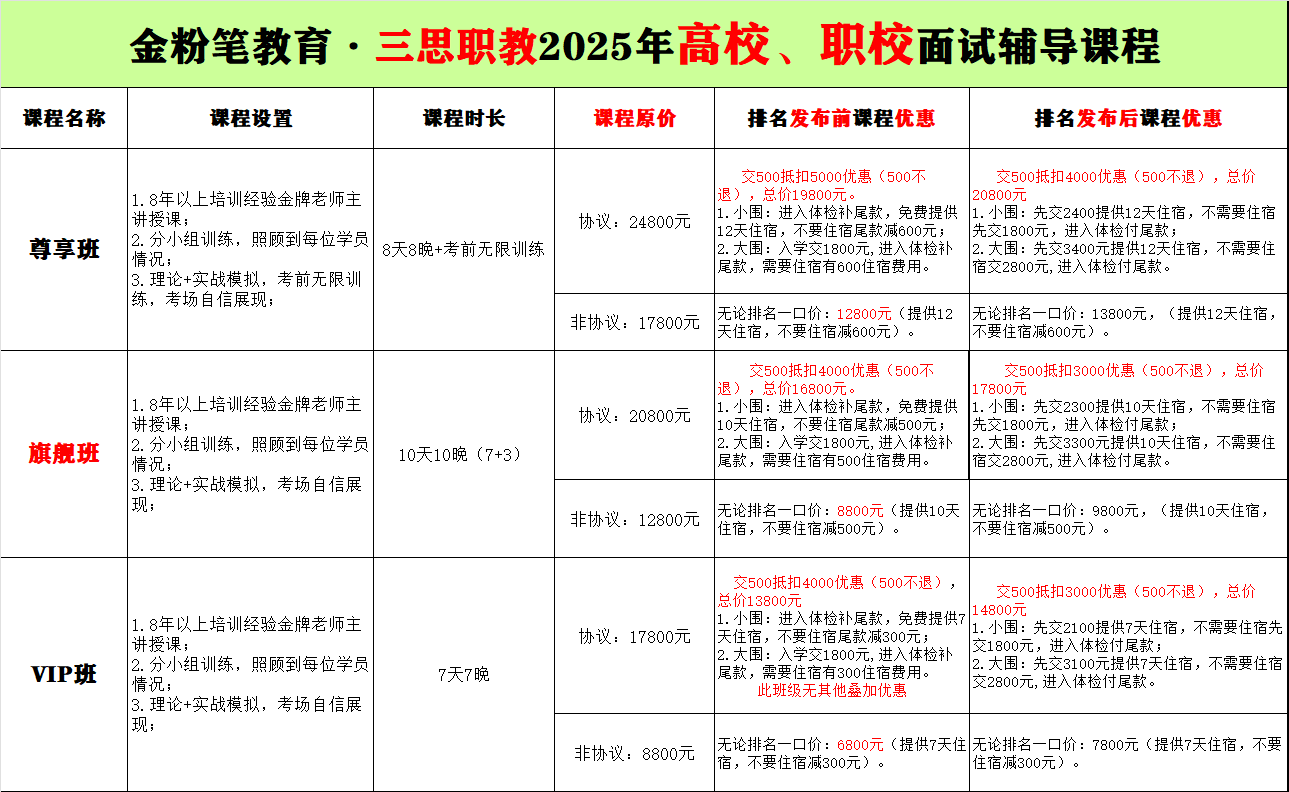 贵州省高校、职校面试专项班,高校职校招聘面试培训班多少钱?面试培训多长时间?贵州高校职校面试培训哪家机构好?贵州金粉笔教育2025年贵州高校、职校面试培训专项课程开设了,培训课程主要针对贵州高校、职校招聘面试考试培训,有至尊VIP班、VIP班、特训班、一对一班次,适合不同的培训人群对于培训时长的要求。具体培训详见贵州高校、职校面试专项培训课程。课程咨询及预定:13368515037(微同)。